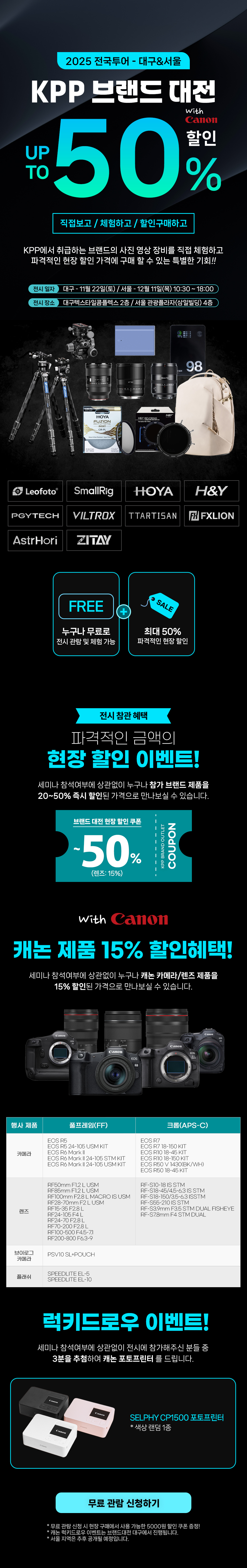 2025년 대구&서울 KPP 브랜드 대전 with Canon 페이지 정보 2025.10.20 - 2025.12.07 본문 목록 이전글아스트로호리 사전예약 85mm F1.8 ii 25.10.20 다음글빌트록스 사전예약 AF50mm F1.4 Pro 소니 E 25.10.17