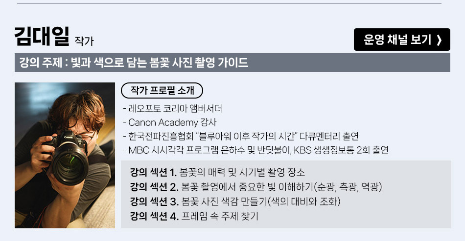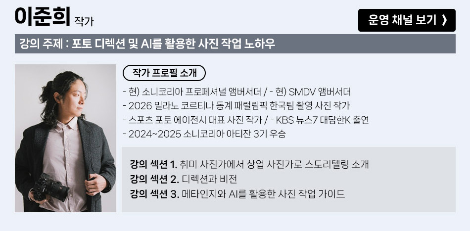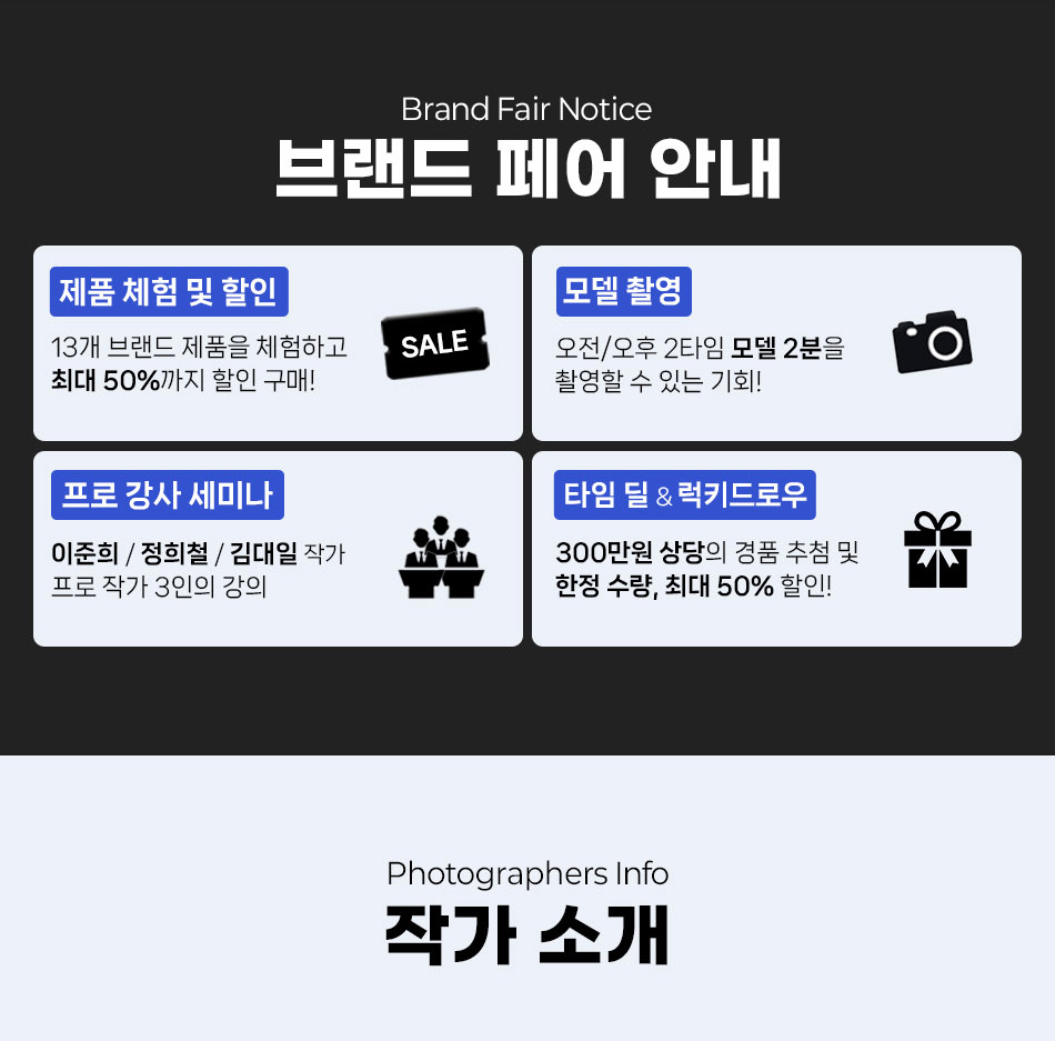 (준비중) 2026 KPP 브랜드페어 부산 with Canon, SMDV 페이지 정보 2026.03.20 - 2026.04.05 본문 준비중입니다. 목록 다음글2026 빌트록스 모델 주빈 스페셜 촬영회 26.03.10